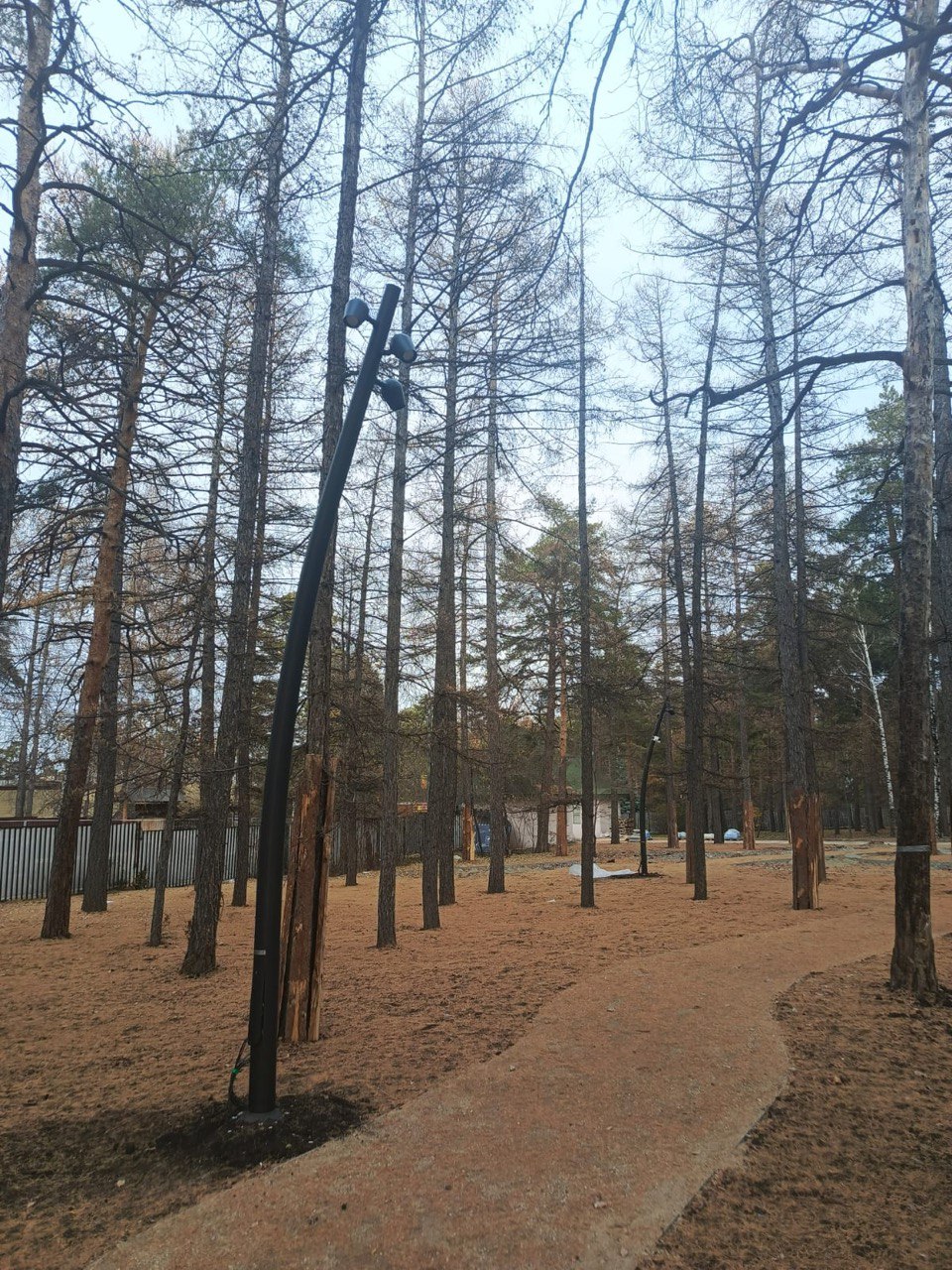 «Алюмпарк» изготовил и поставил два вида опор: круглоконические и гнутые. Цвет черный, поверхность брашированная. Специально под проект выполнили заказ: нестандартная высота 4,9 м и 6,9 м. Дополнительно для гнутых опор изготовлены заглушки, чтобы внутрь не попадали дождь, снег, пыль.