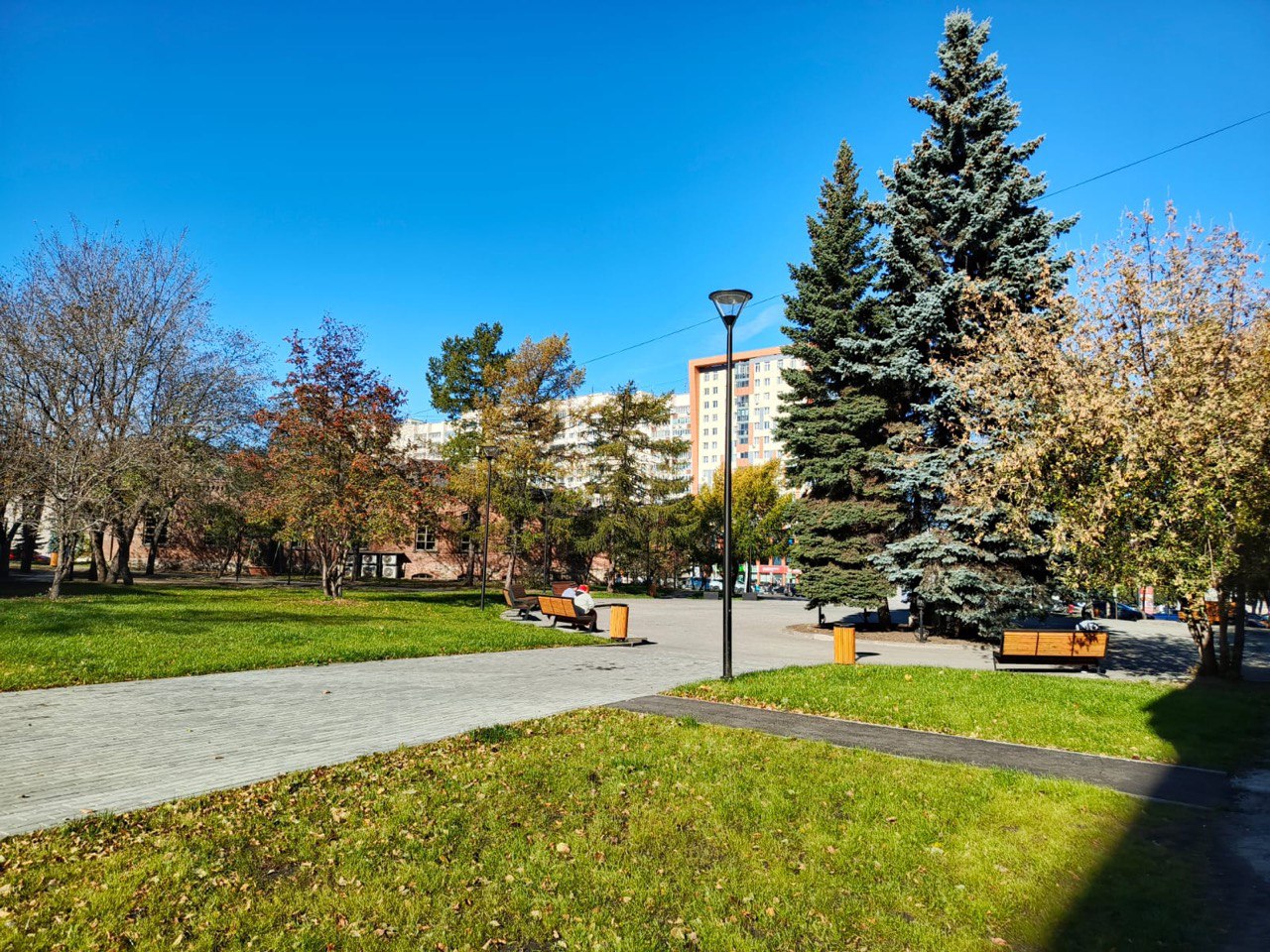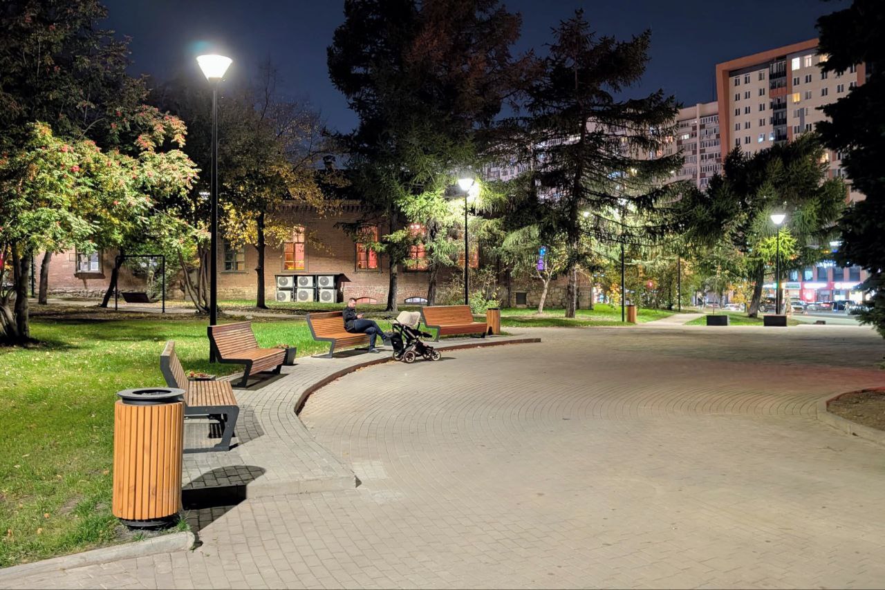 Реновацию городского пространства провели летом 2025 года. Заменили плитку, установили освещение, новые скамейки и урны, заасфальтировали проезды и парковку.