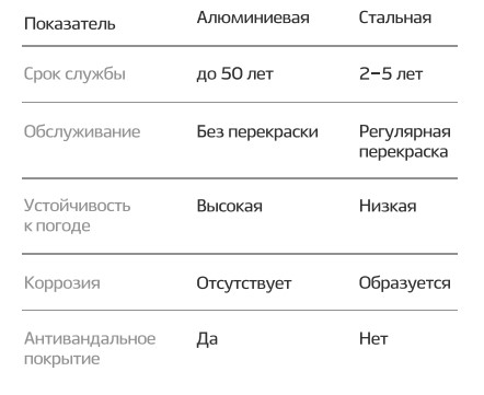 Вот сравнительная таблица анодированной алюминиевой опоры и стальной.